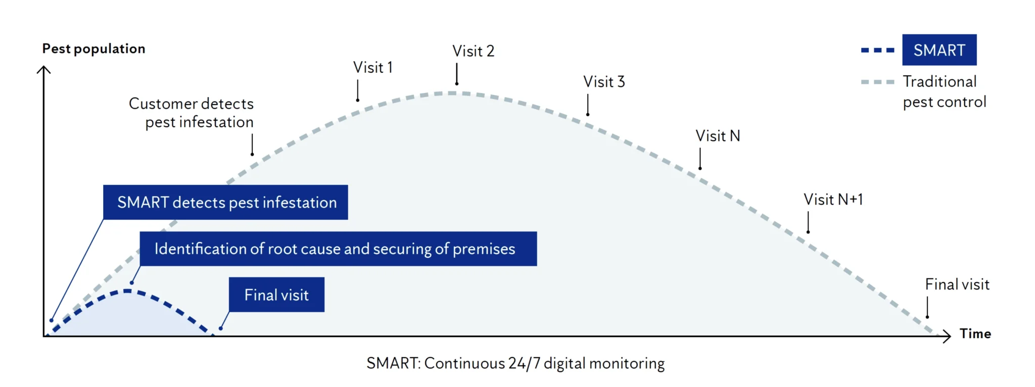 As depicted in the figure above, our SMART solution supports early detection of pest infestations, with quick identification of root cause, and often immediate and non-toxic remediation. This contrasts sharply with traditional approaches where infestations are detected later, allowing pest populations to grow significantly before traps and pesticides are applied. The traditional method requires physical visits to check status and perform re-baiting and emptying traps, meaning that several visits to the customer premise are required before the pest issue can finally be resolved.